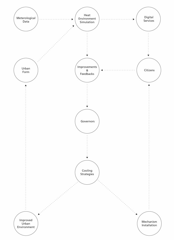 Figure 6. The left diagram displays the system for urban heatwave mitigation; the right diagram displays the urban scenario.