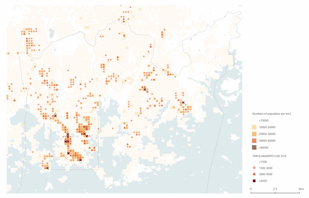 Figure 2. The distribution of Helsinki’s population and elderly people.