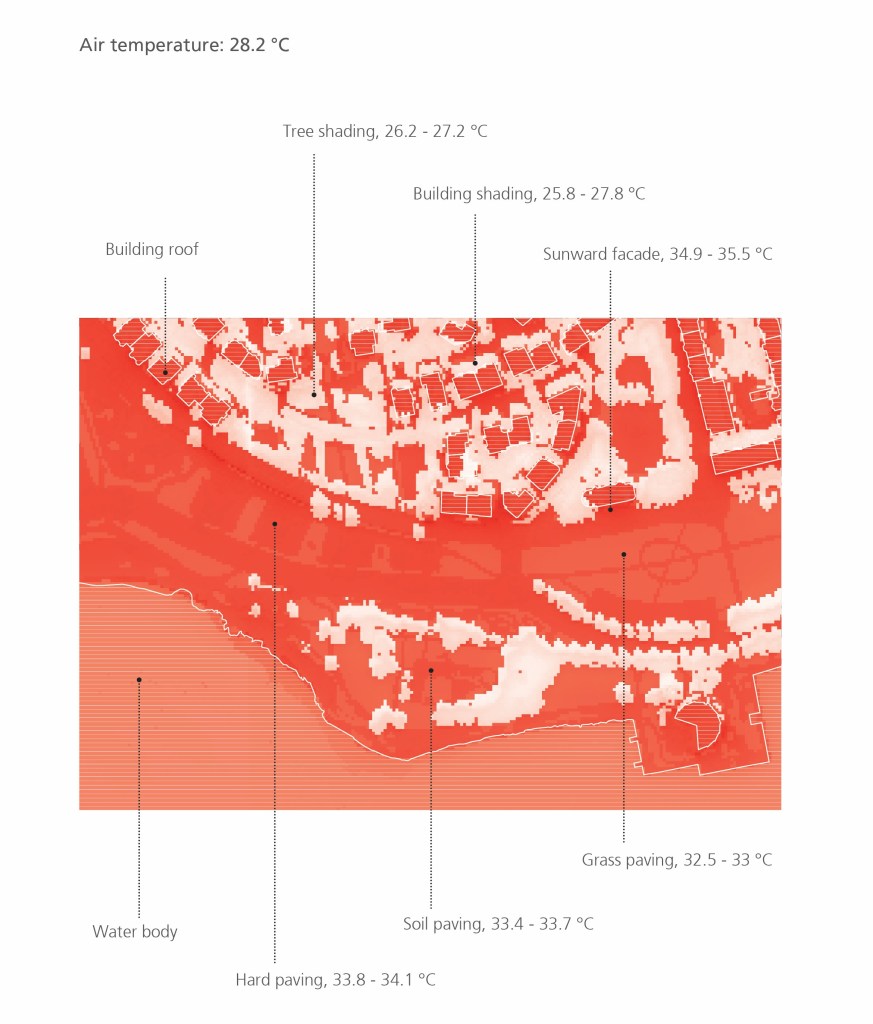 In general, the open space without shading such as wharves, arterial roads, squares, and artificial parks has very high thermal stress on the human body in summer due to lack of shelter from trees or buildings (Figure 3). Moreover, changing surface materials shows few improvements (≈ 1°C) in human perception in simulation, while tree canopy is a reliable measure to reduce 7 or 8 °C thermal perceptions.