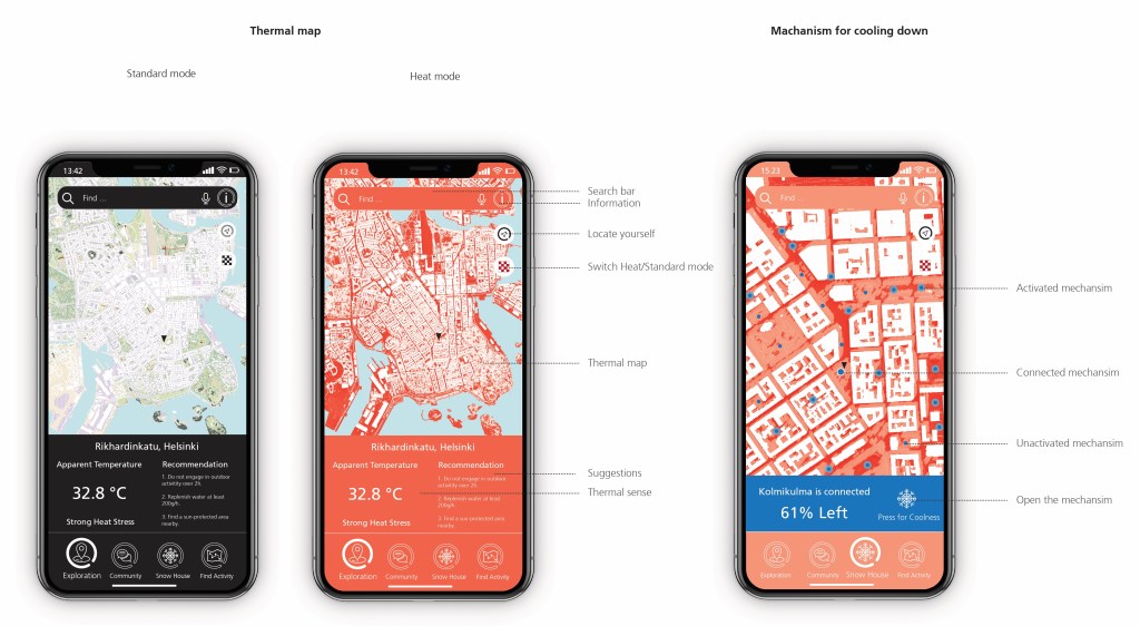 The design of an interactive platform provides citizens with substantial services in summer (Figure 5). As a carrier of thermal environment simulations and designs, the designed web-based platform interacts with residents and urban managers in a more intuitive and visual method. The designed application, as the output of the platform, consists of four primary services: Exploration of the Urban Heat Map, Feedback from Citizens, Outdoor Activity Guidance, and Integration of Snow House Mechanism in the Application.