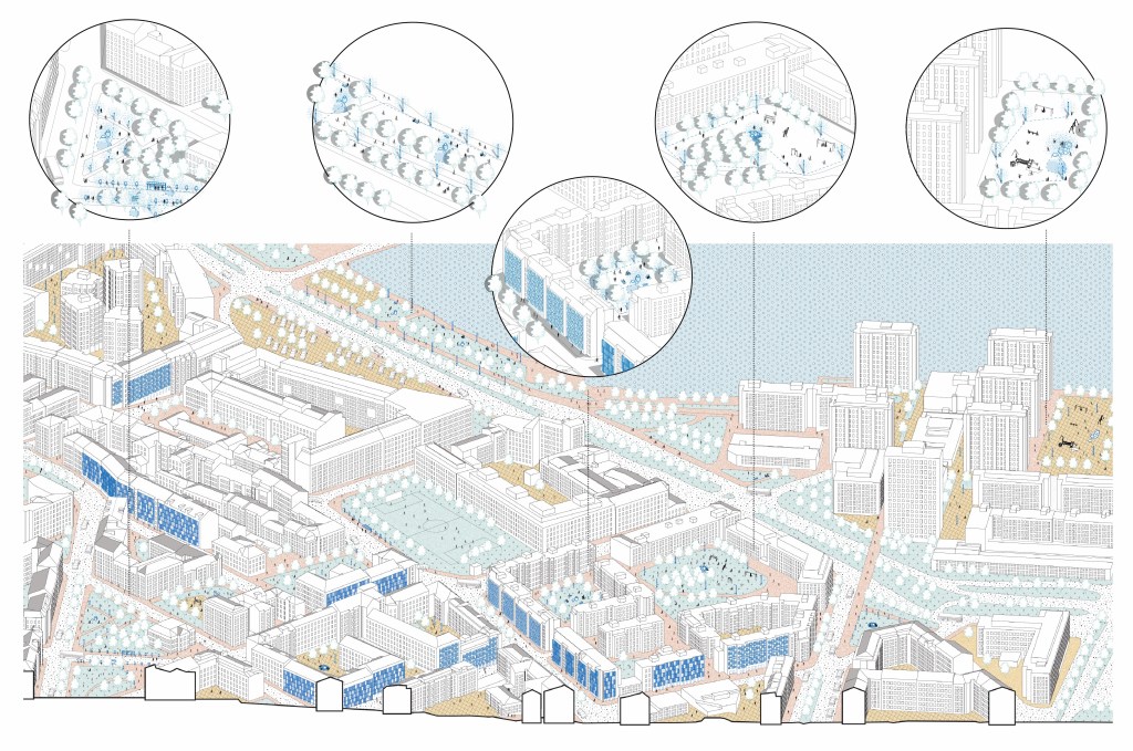 Combining with the Helsinki Sustainable Development Goals, future urban scenarios have prospected. In the scenario, multiple combinations of urban cooling strategies are implemented according to different functional spaces, transforming Helsinki into the most functional city with implementing sustainable development responsibility locally (Figure 6). Towards this objective, the implemented interventions impact Helsinki and its inhabitants. On the one hand, the design works fill the existing gap in urban services and infrastructure in the forthcoming extreme climate. On the other hand, participating in the thermal environment confrontation will popularize sustainable awareness among urban residents. Moreover, the characteristics of sustainable development and government-resident interaction will make Helsinki the city unique.