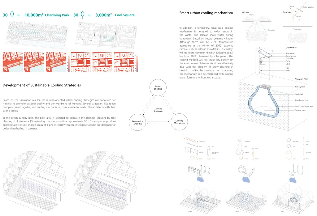 In addition, a temporary, small-scale cooling mechanism is designed to collect snow in the winter and release snow water during heatwaves based on future extreme climate. Although there will be 2 °C temperature ascending in the winter of 2050, extreme climate such as intense snowfall (> 10 cm/day) will be more common (Finnish Meteorological Institute, 2019). Powered by solar panels, this cooling method will not cause any burden on the environment. Meanwhile, it can effectively deal with the problem of snow cleaning in Helsinki. Unlike the previous two strategies, the mechanism can be combined with existing urban furniture without extra space.