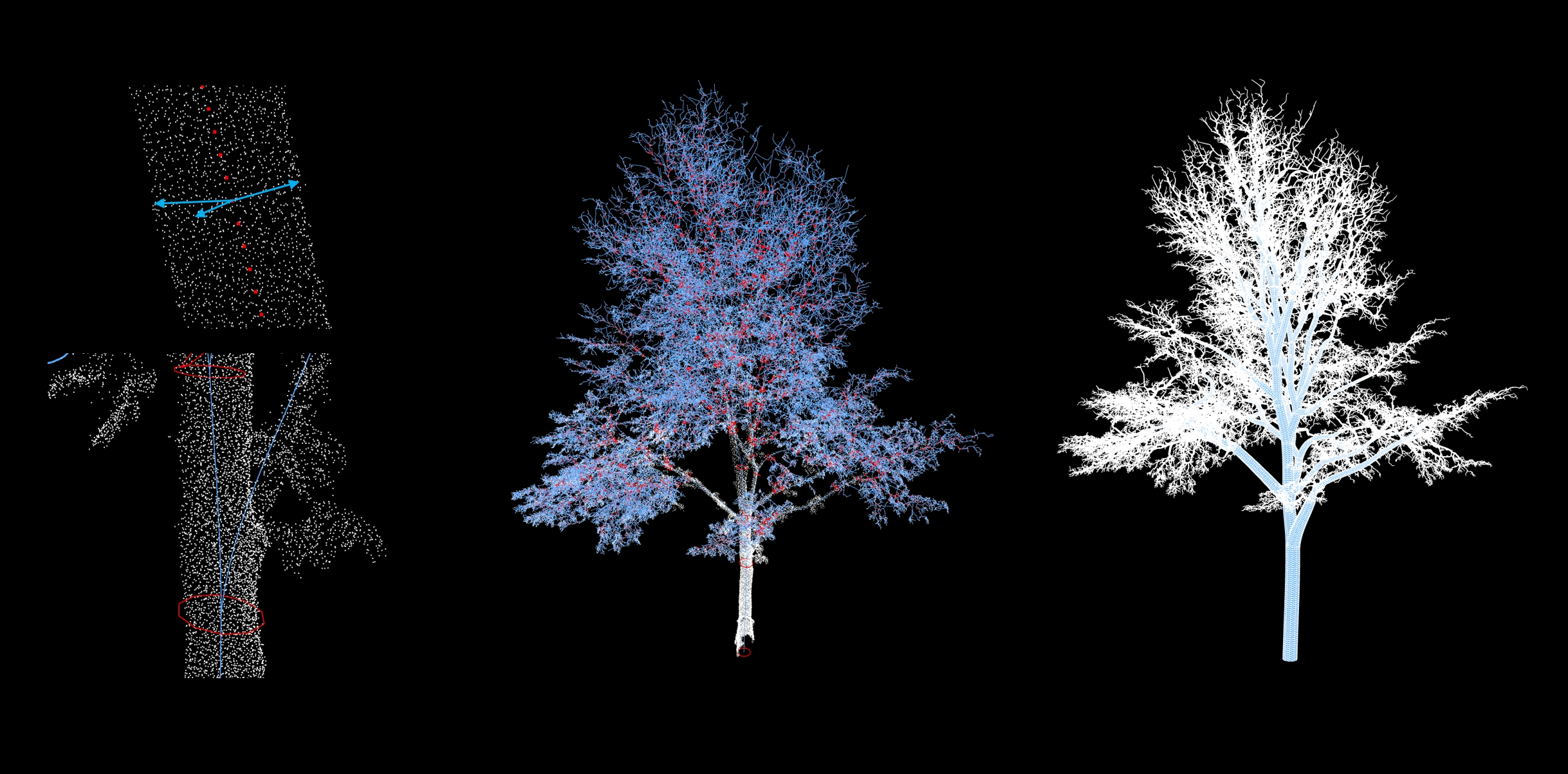 Our method, tested in Helsinki’s Jätkäsaari area, leverages pre-defined skeleton data to train the neural network, streamlining the extraction of movement direction and distance, thus bypassing traditional skeletonization’s iterative nature. We further refine our model’s accuracy and robustness by incorporating point clouds of varying densities and tailoring our approach to account for the morphological diversity of specific tree species. This specificity enables our models to more closely mirror real-world trees, making them invaluable for dynamic environmental modeling within urban digital twins. Moreover, our models support integration with the L-system, a prominent plant growth simulation algorithm, showcasing the potential of advanced neural networks to revolutionize computational architecture and foster precise, sustainable urban environmental simulations.