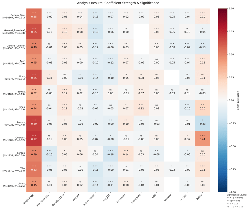 Urban trees are critical for climate mitigation, yet the inhibitory effects of the urban matrix remain underquantified. This study leverages multi-source LiDAR to reconstruct the carbon sequestration trajectories of 45,576 trees in Helsinki (2015–2023). Regression analysis reveals that urban environmental factors are deterministic drivers, explaining 13–52% of growth variance. Crucially, we identify a non-linear “stress penalty” where solar radiation and heat—typically growth-promoting—act as metabolic stressors alongside anthropogenic noise. Based on differential sensitivities, we classified taxa into structure-dependent specialists (Quercus, Pinus), atmosphere-sensitive indicators (Sorbus, Tilia, Acer), and resilient generalists (Betula). These findings challenge aesthetic-based planting, advocating instead for performance-based zoning: utilizing resilient species in high-stress canyons and reserving park sanctuaries for high-potential giants to urban climate mitigation infrastructure.